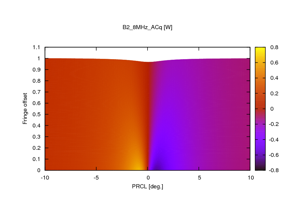 Finally, these two plots shows the 8MHz demodulated signal. The behavior is very similar, meaning that B2_8MHz_ACp could in principle be used in place of B2_3f_ACp from the beginning of the lock acquisition sequence.