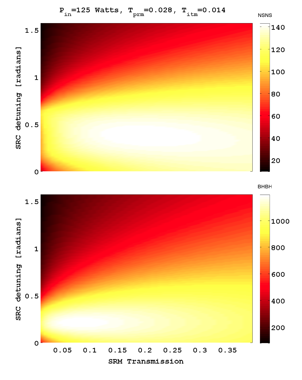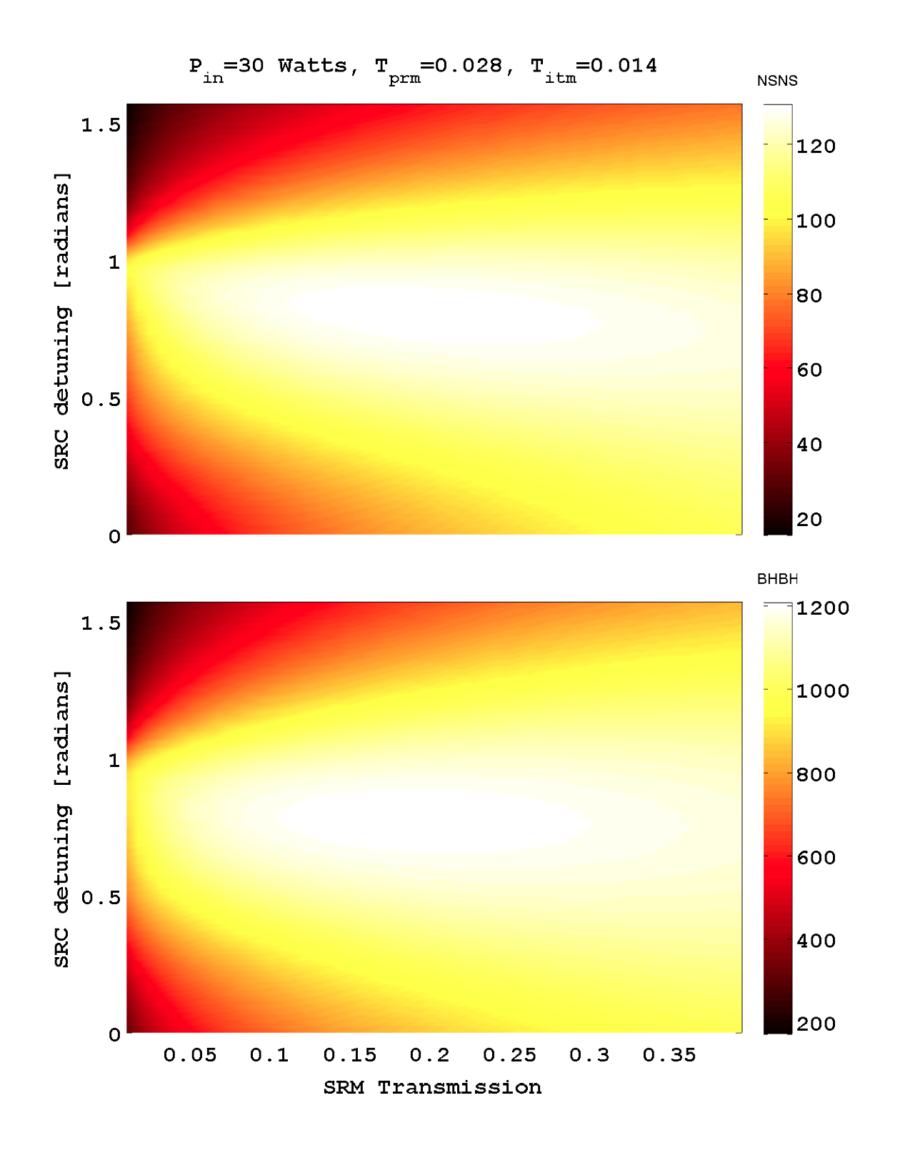 This plot shows the NSNS and BHBH range as the SRM Transmission and SRC detuning phase are varied. The readout quadrature is fixed at pi/2. The conclusion is that, for NSNS optimization, the choice of SRM transmissivity hardly even matters, as long as the detune phase is around 0.35 radians. We choose a SRM Transmission of 0.2.